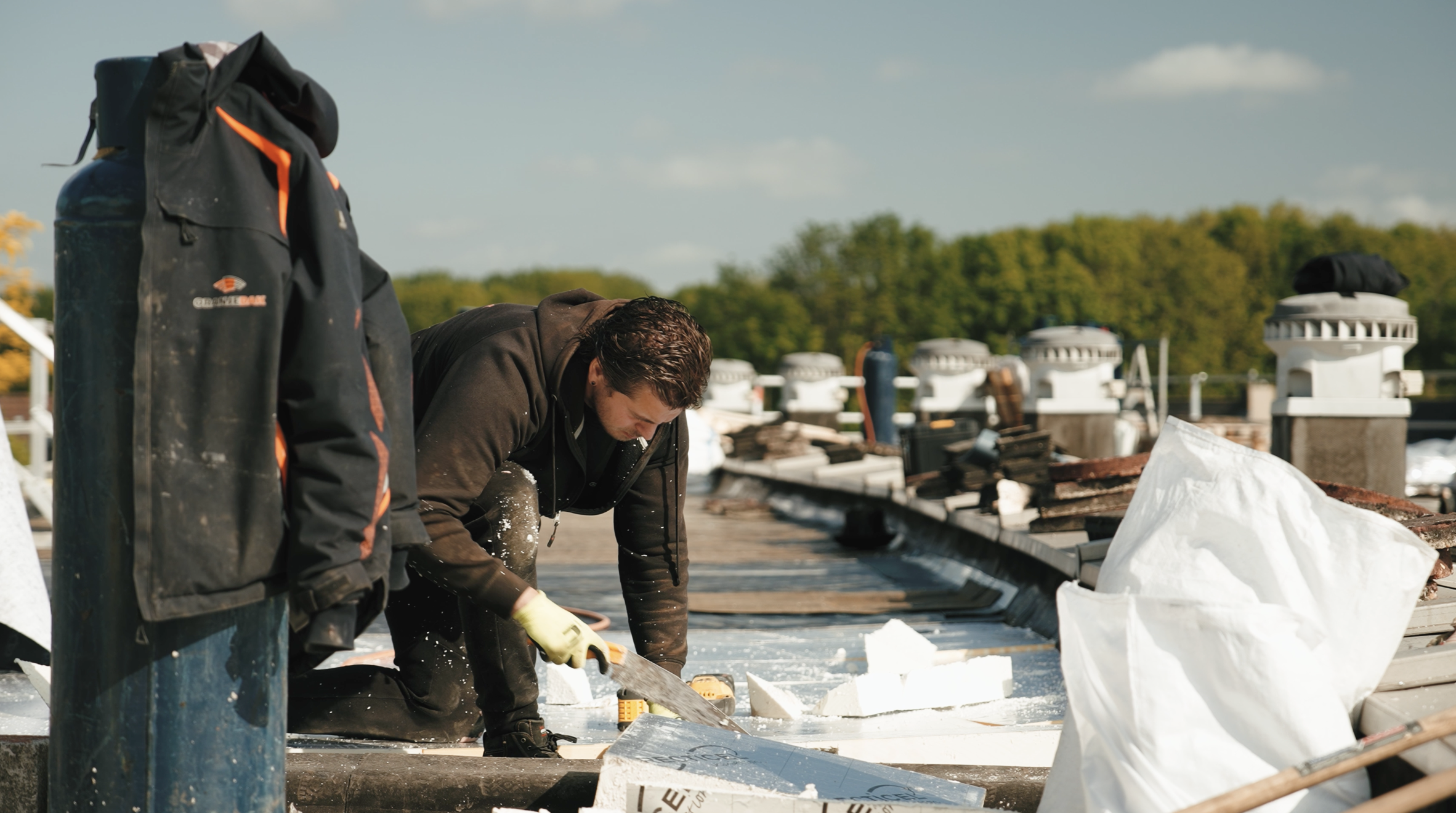 Daarna legden we gloednieuwe isolatieplaten neer die strak op elkaar aansloten. Zo bleef warmte ’s winters binnen en warmde het dak in de zomer minder snel op. Boven op de isolatie brandden we een verse bitumenlaag vast; die vormde de waterdichte schil van het nieuwe dak. Tijdens dit werk hielden we de afvoerpunten vrij en testten we of alles netjes afliep, zodat regenwater later goed weg kon.